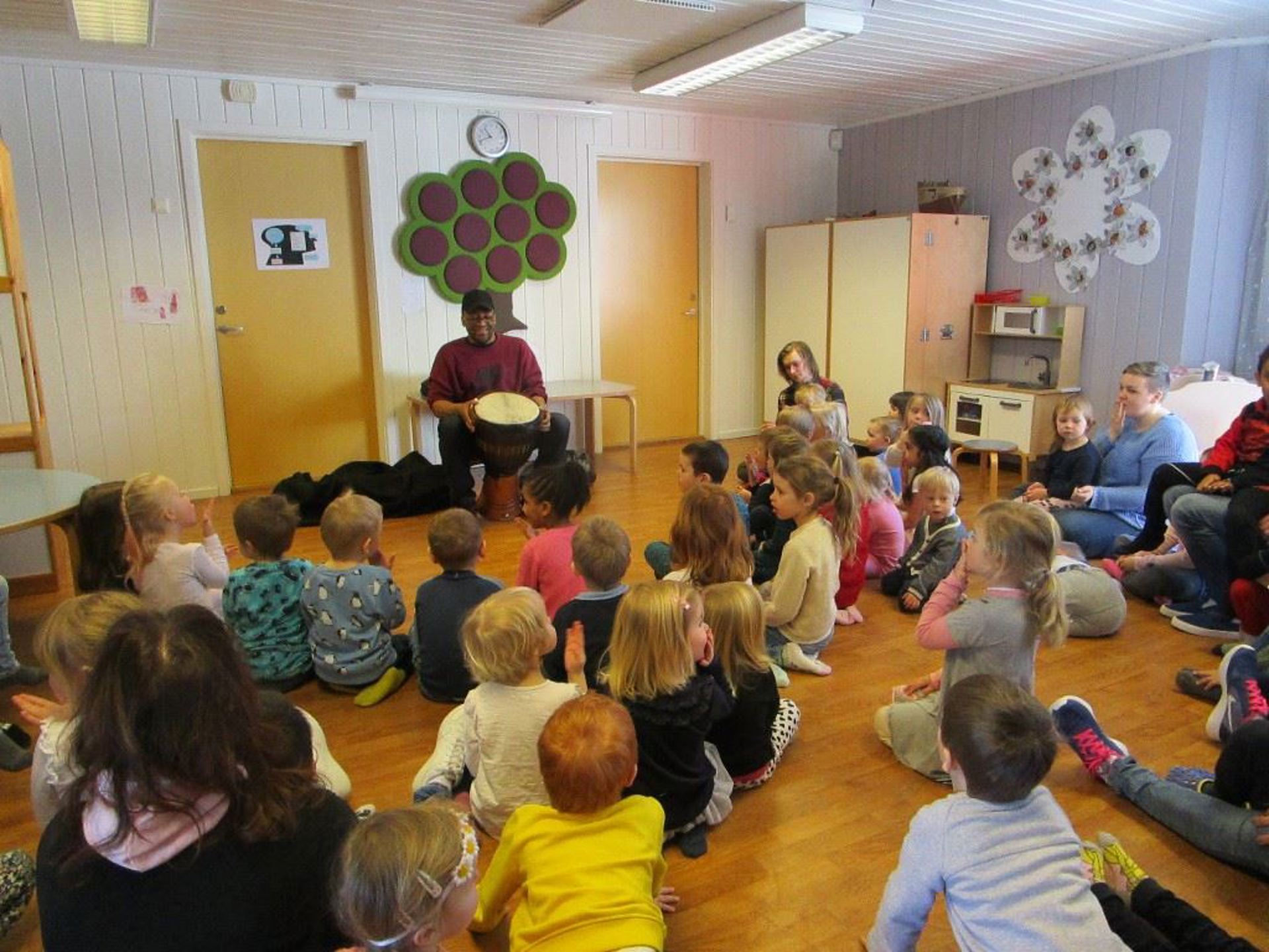Trommer har vært i fokus denne formiddagen og Bakary har tatt med seg alle barna inn i en rytmisk verden. Barna fikk komme frem og spille egen tromme sammen med Bakary, og kjente og nye sanger er sunget og trommet til. En flott dag for små og store:) Rett og slett magisk og rytmisk:) "Oh Alele" ljomet i hele barnehagen, og sangen ble forlenget med flere vers.