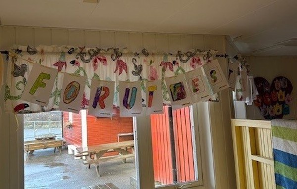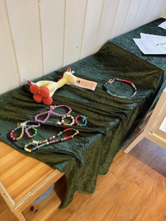På basaren var det mulig å støtte formålet, FORUT barneaksjon, ved å bestille leker og div., eller ved å gi en pengestøtte ved servering. Førskolebarna/ Hakkespettene hadde laget høstbilder og perlekjeder som de auksjonerte bort:)